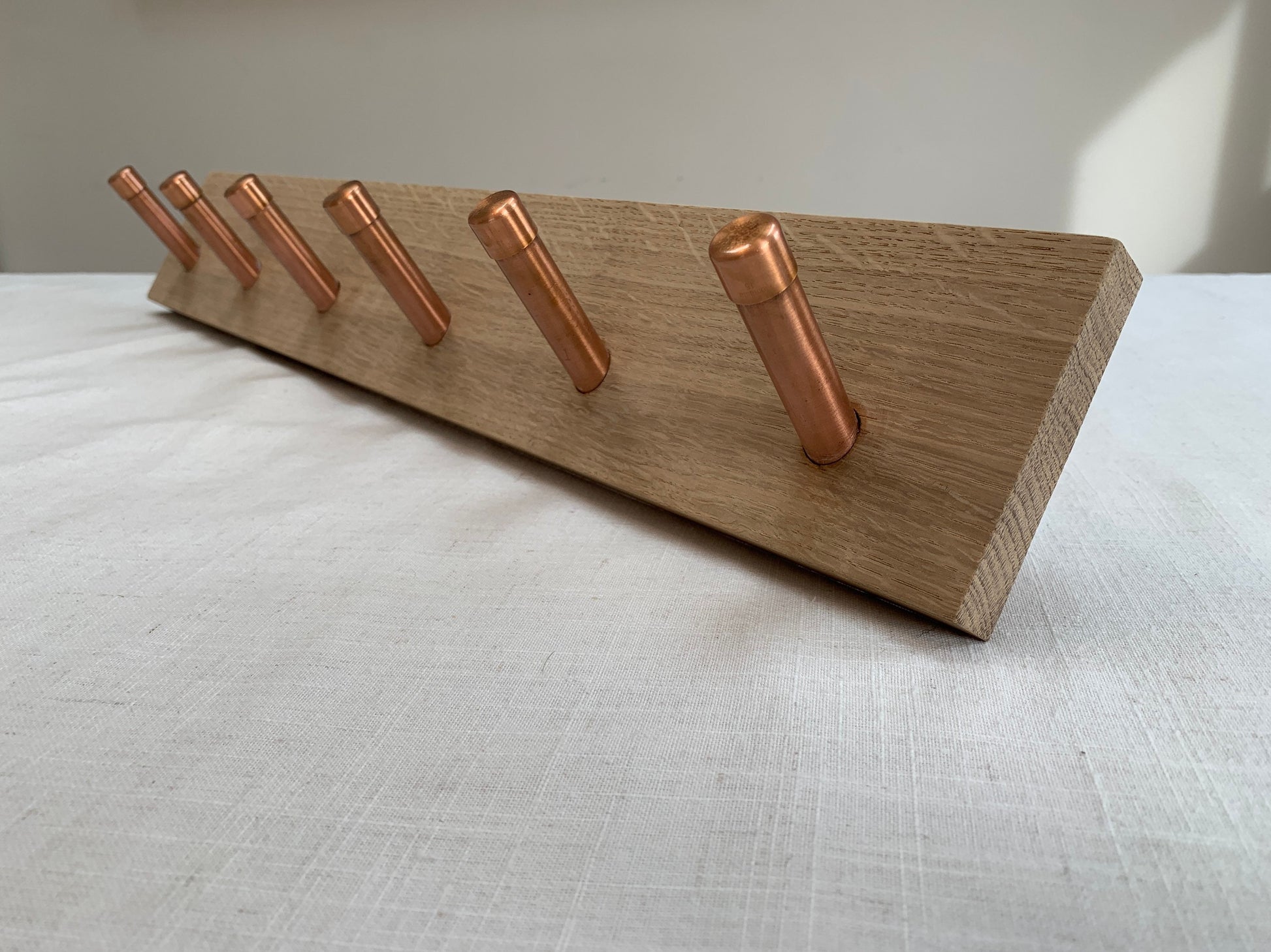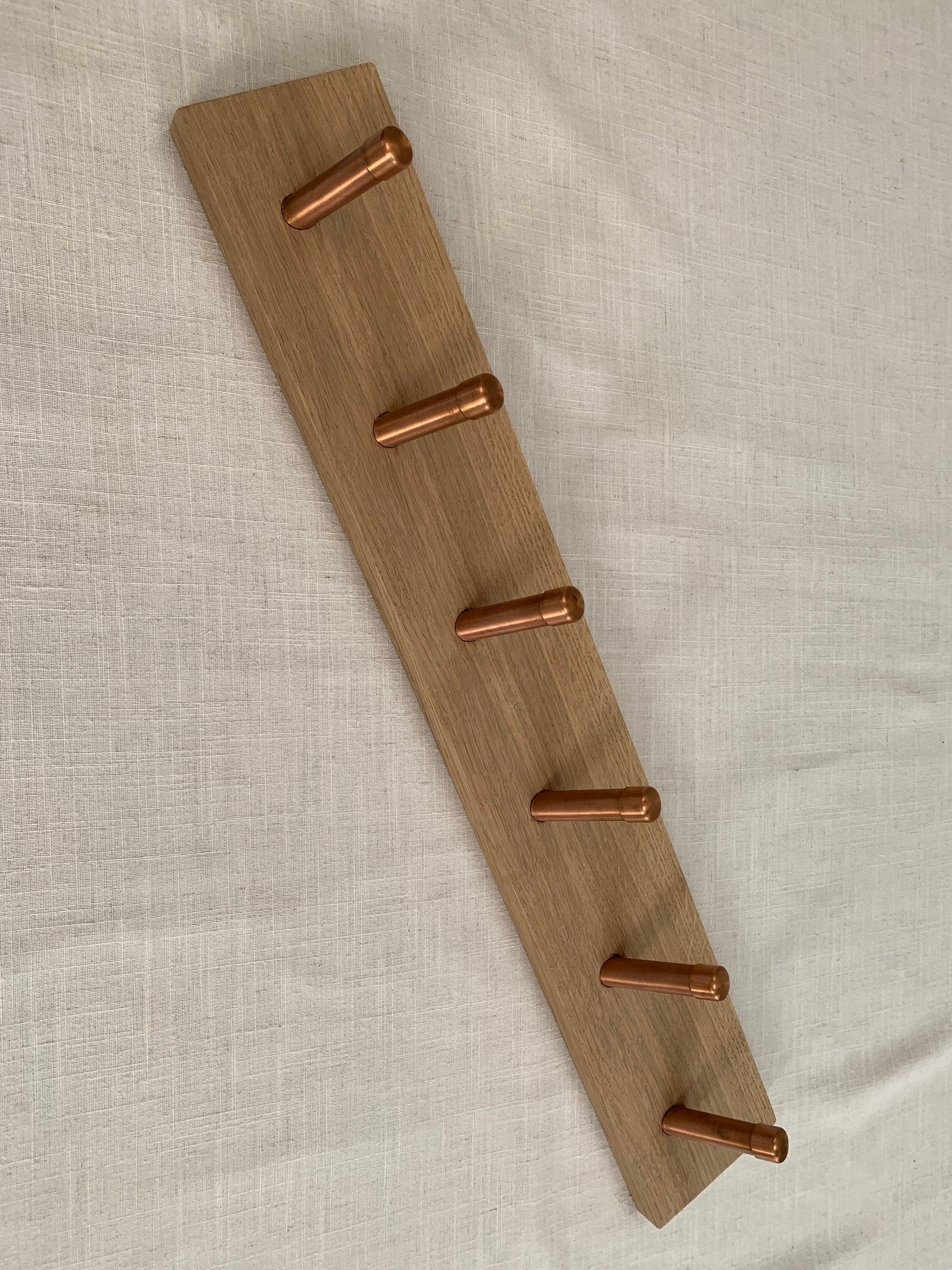A handmade solid Oak peg rail with copper pegs, made to order in any width.